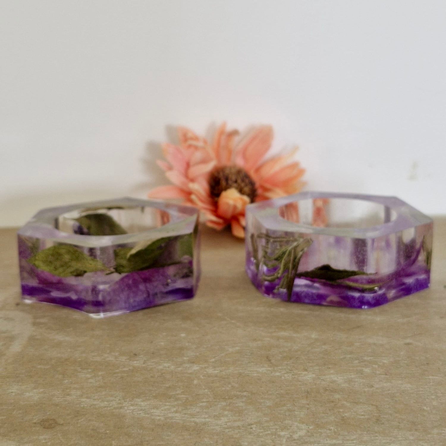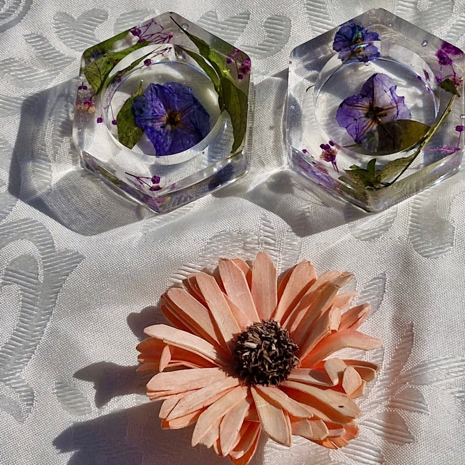פמוטי המשושה הם יצירות אפוקסי בעבודת יד, המשלבות עיצוב גאומטרי עדין עם נגיעות טבע.