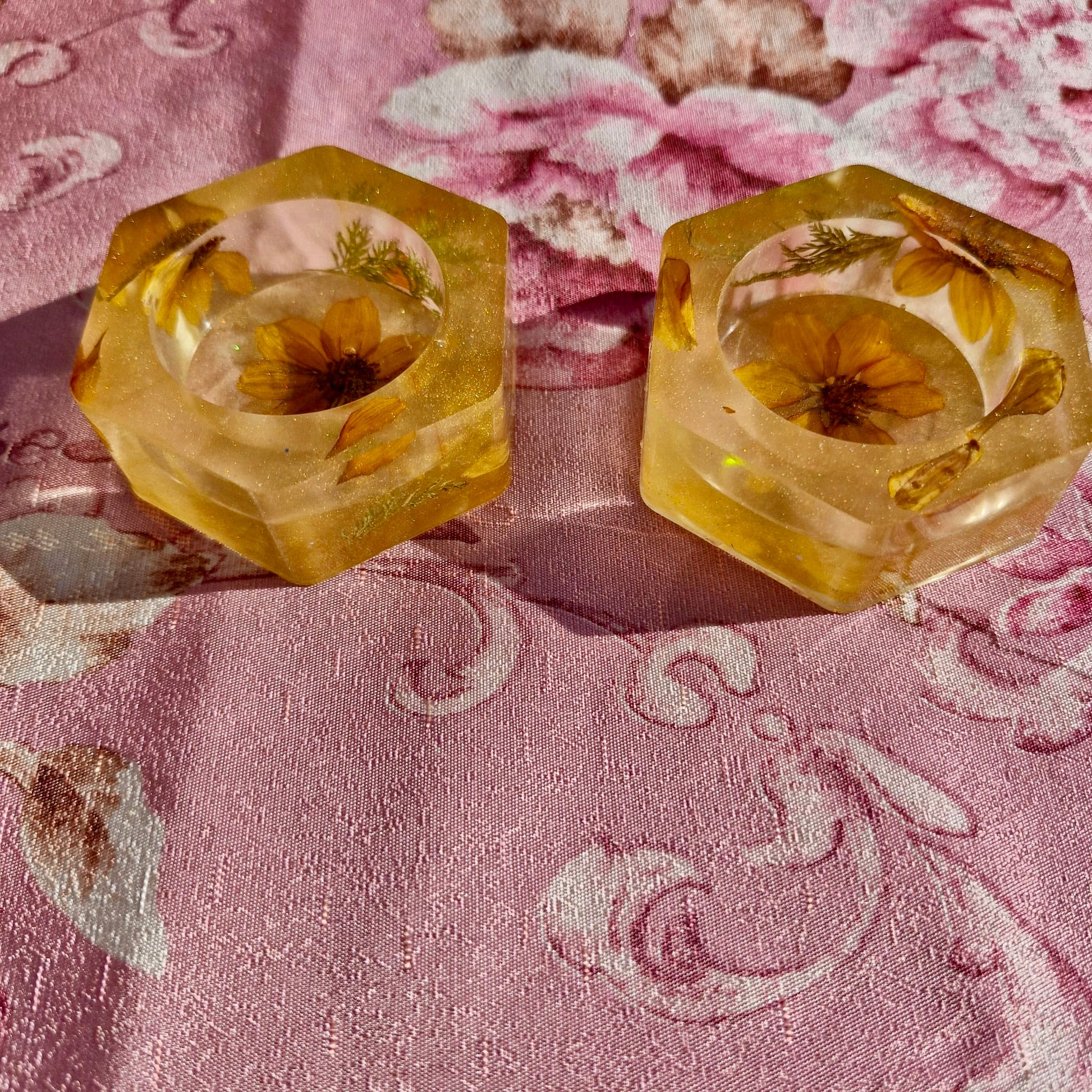 פמוטי המשושה הם יצירות אפוקסי בעבודת יד, המשלבות עיצוב גאומטרי עדין עם נגיעות טבע.