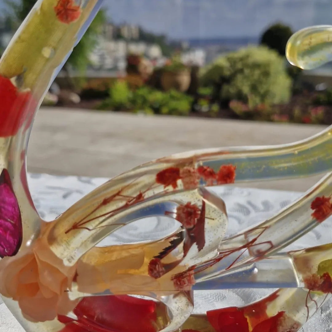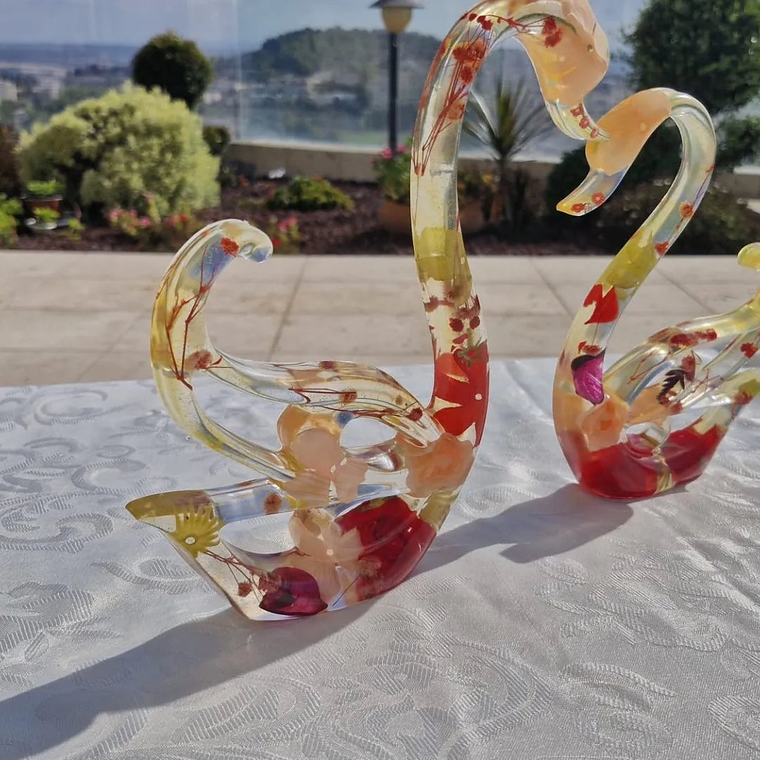 הברבורים של Bags & Home מיוצרים בעבודת יד מחומר אפוקסי איכותי, המאפשר שילוב של צבעים, טקסטורות ואלמנטים טבעיים כמו פרחים, זהב או צדפים. כל זוג ייחודי ושונה מקודמו – אין שניים זהים.