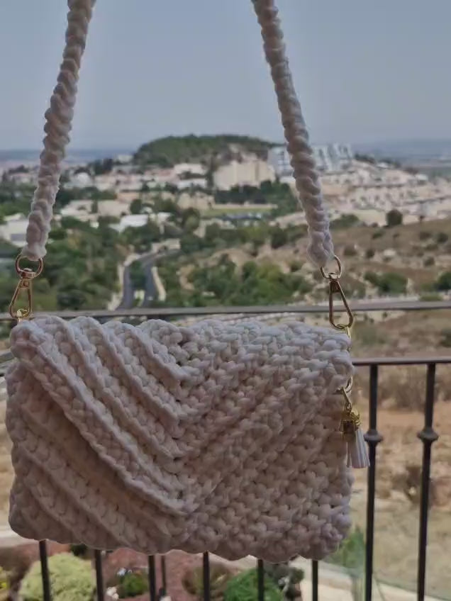 הסריגה נעשית בקפדנות ובסבלנות, מתוך חיבור עמוק לחומר ולתהליך, ותשומת לב לפרטים הקטנים שעושים כל תיק לייחודי.