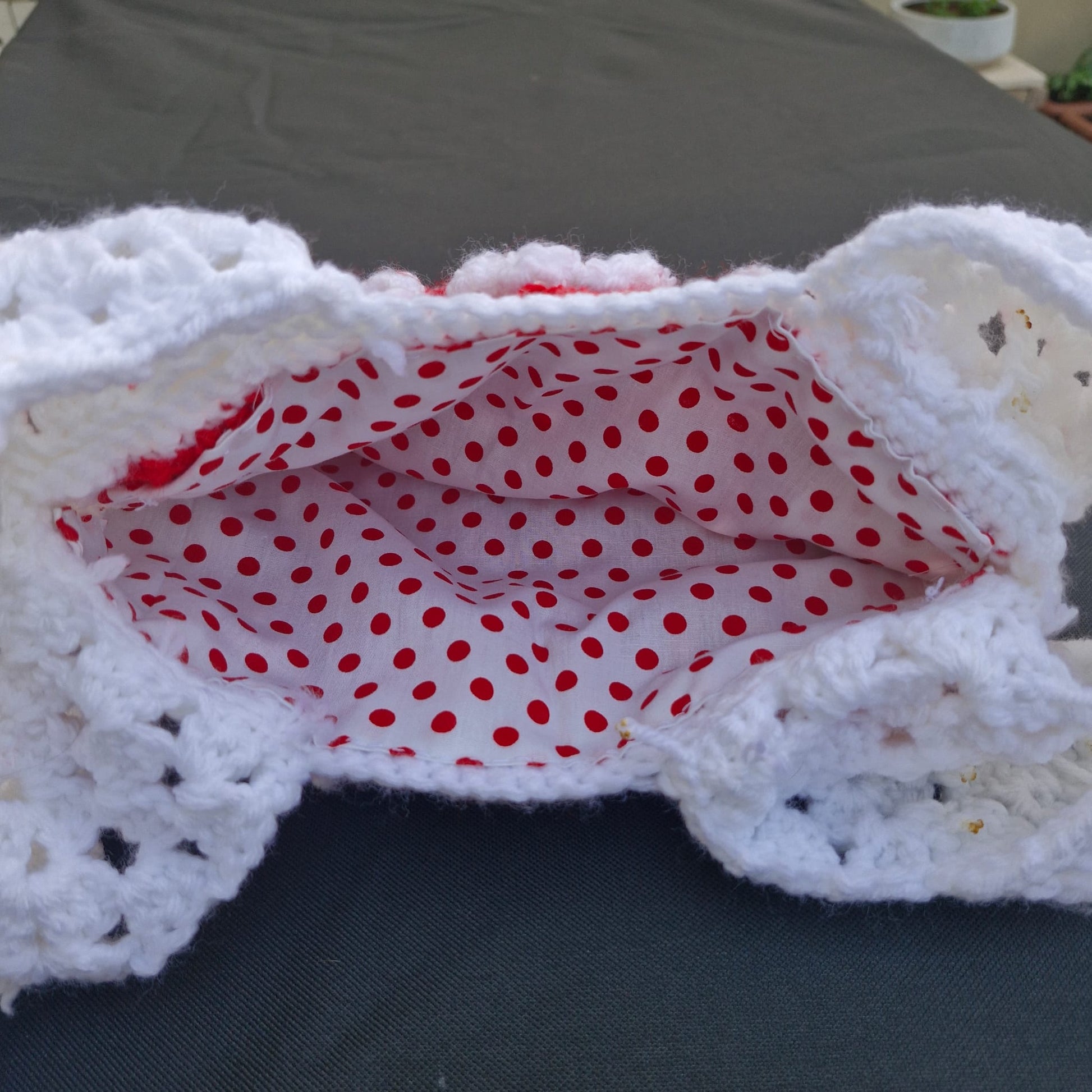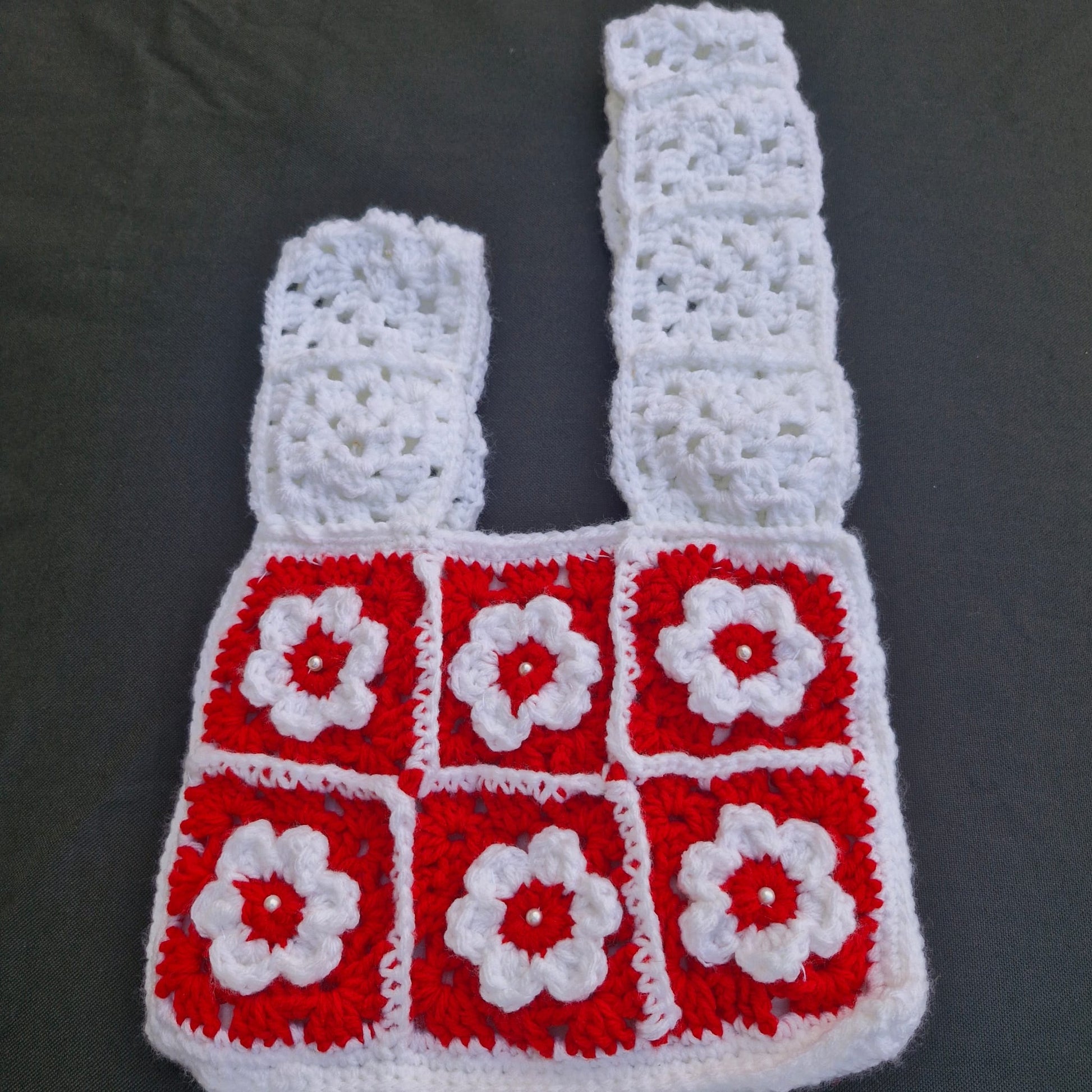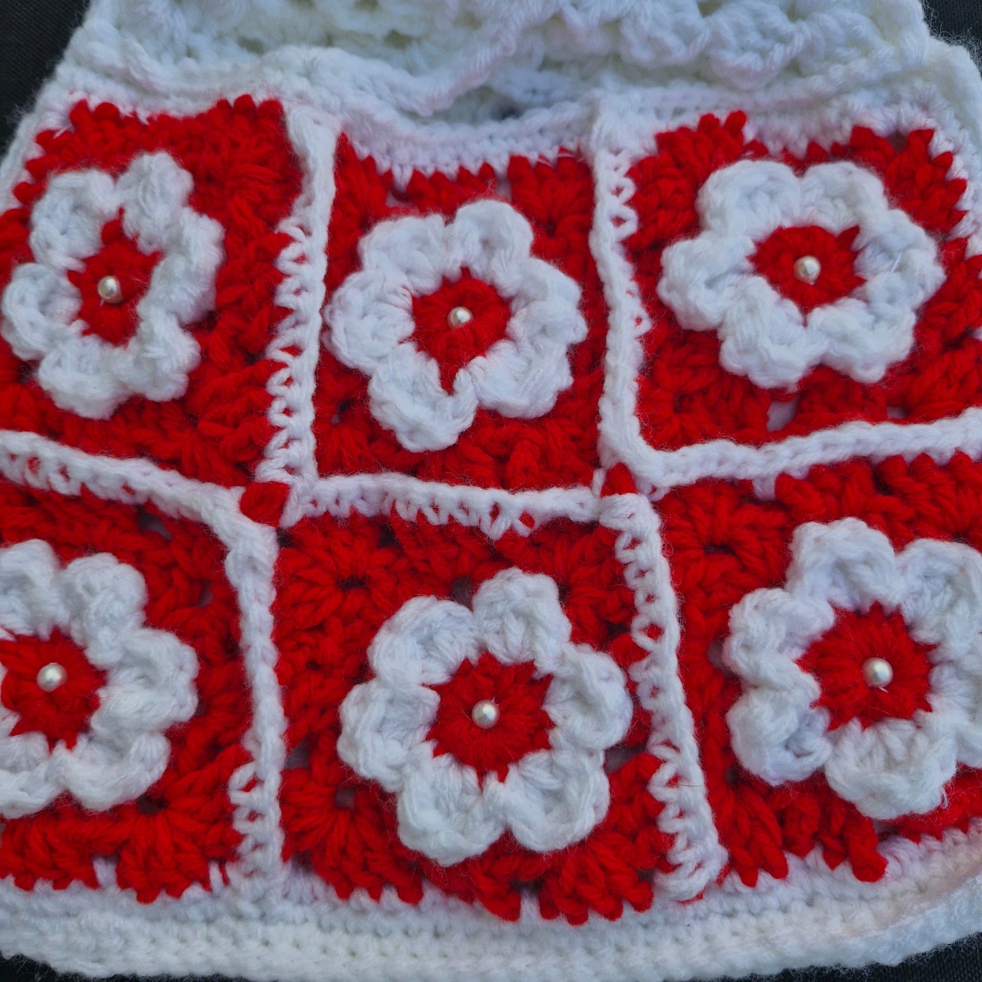 הסריגה יוצרת מראה פרחוני עדין, עם קונטרסט נעים בין אדום ללבן, שמוסיף אופי ואמירה אישית.